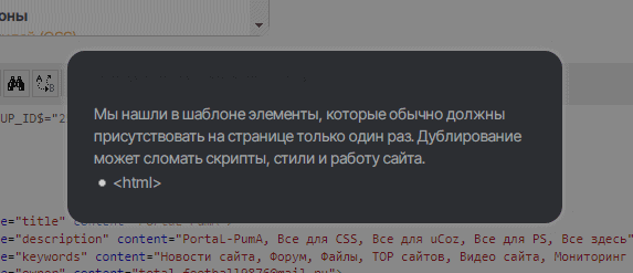 Скорее всего, я догадался, почему так вышло. Ну, ошибки были и есть у меня на сайте. До этого нововведения со стороны uCoz (вот этот скрипт, который выводит это сообщение) просто при сохранении не было таких ограничений, и всё сохранялось (без проверки наличия ошибок в исходном коде моего шаблона). А сейчас они ввели вот эту проверку, и теперь всё и "ломается". И я как раз при нажатии на кнопку "Сохранить" и ломал сайт.